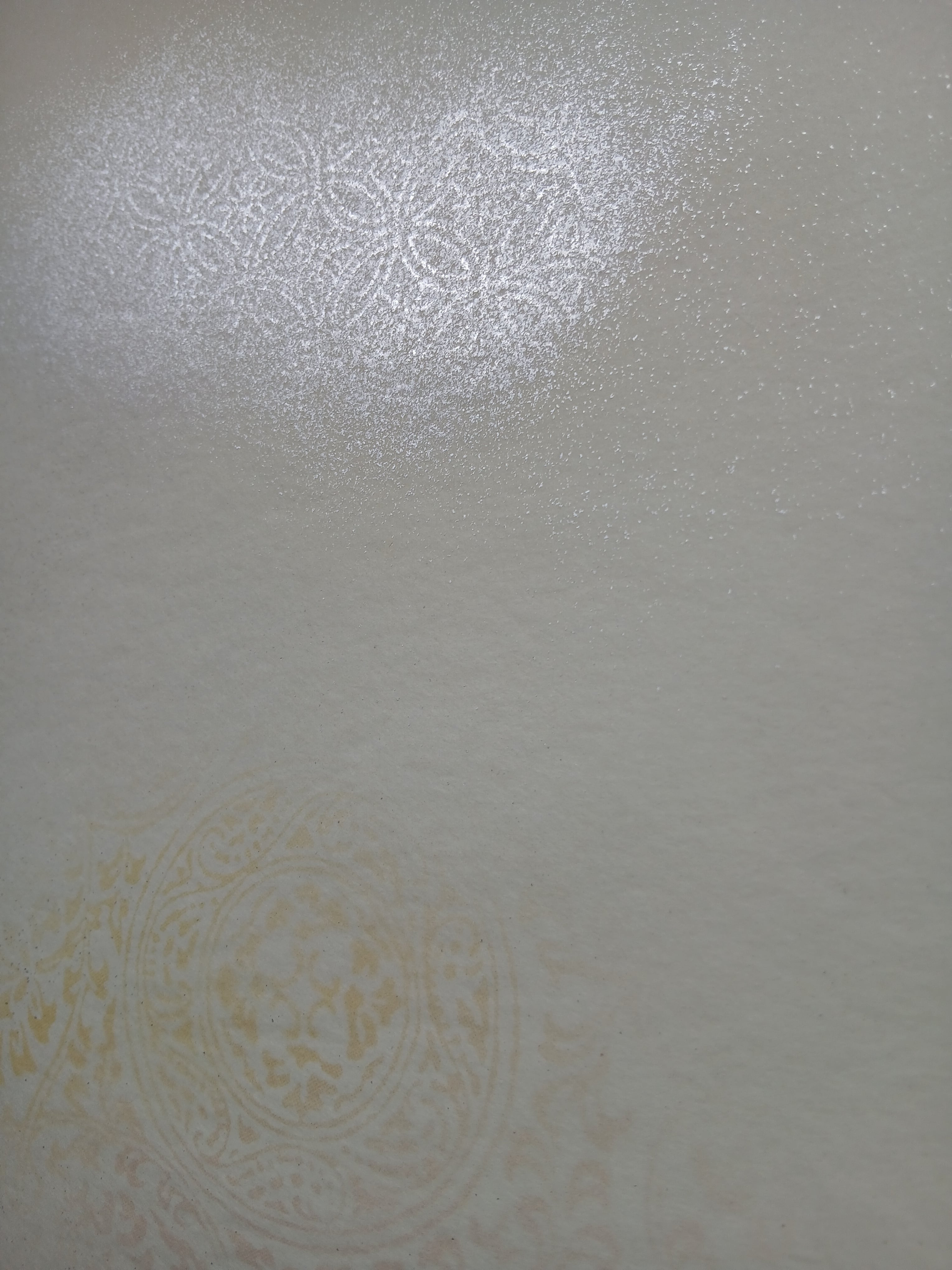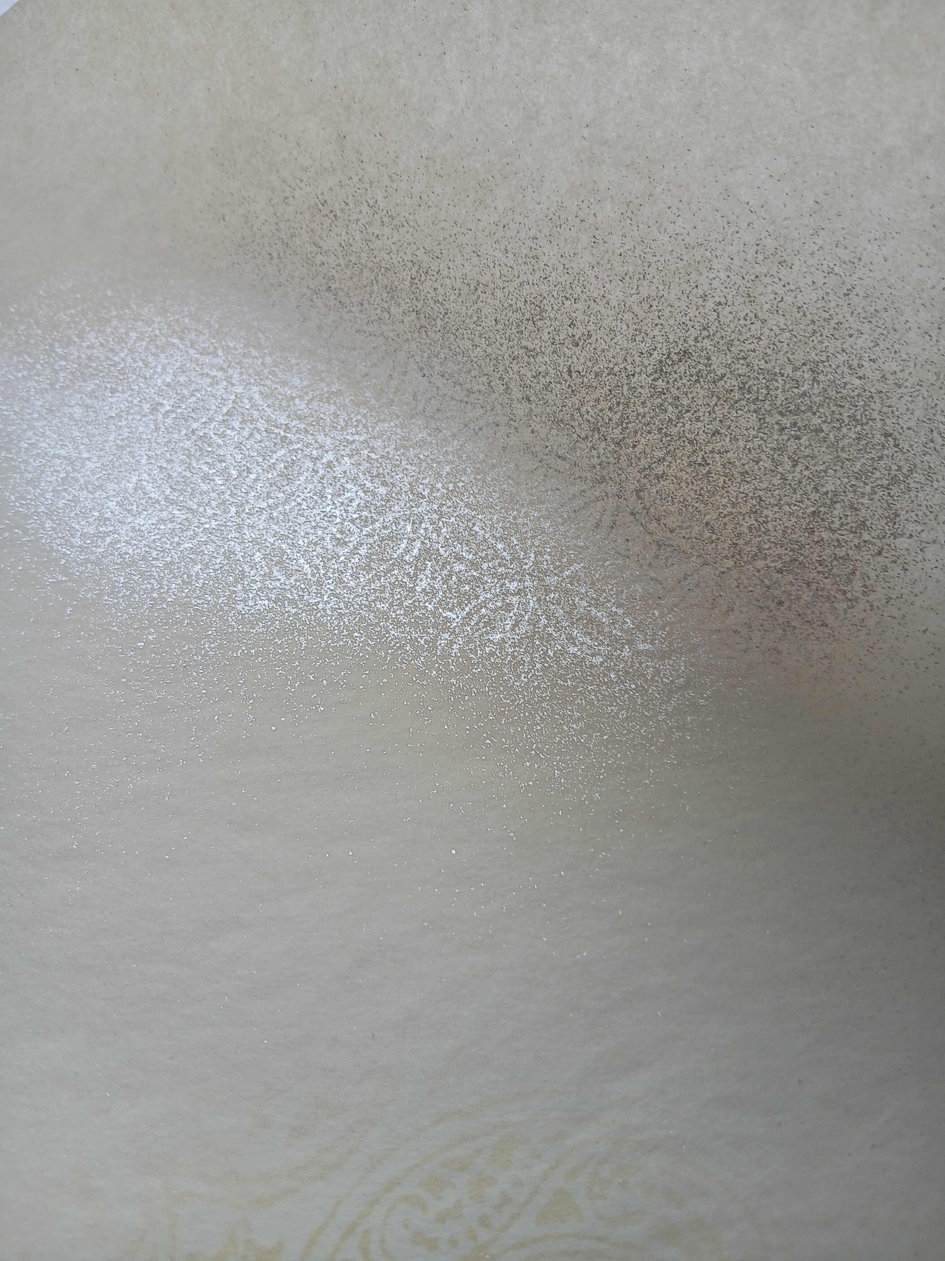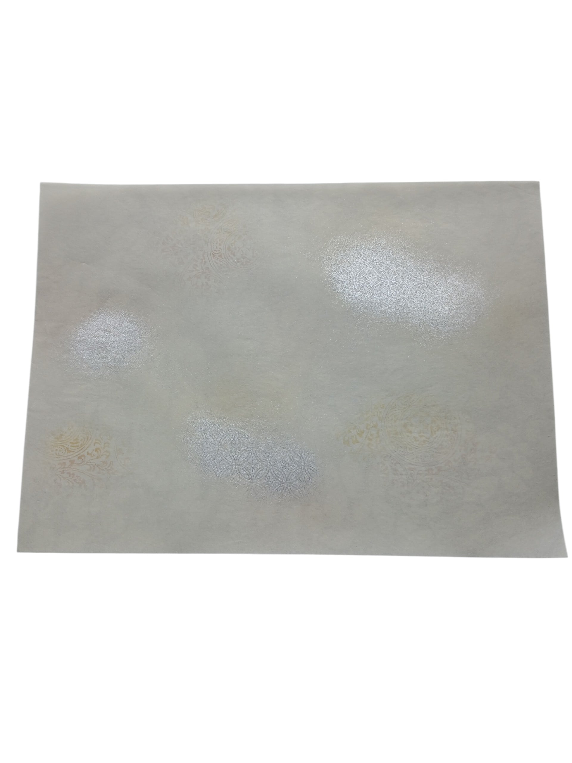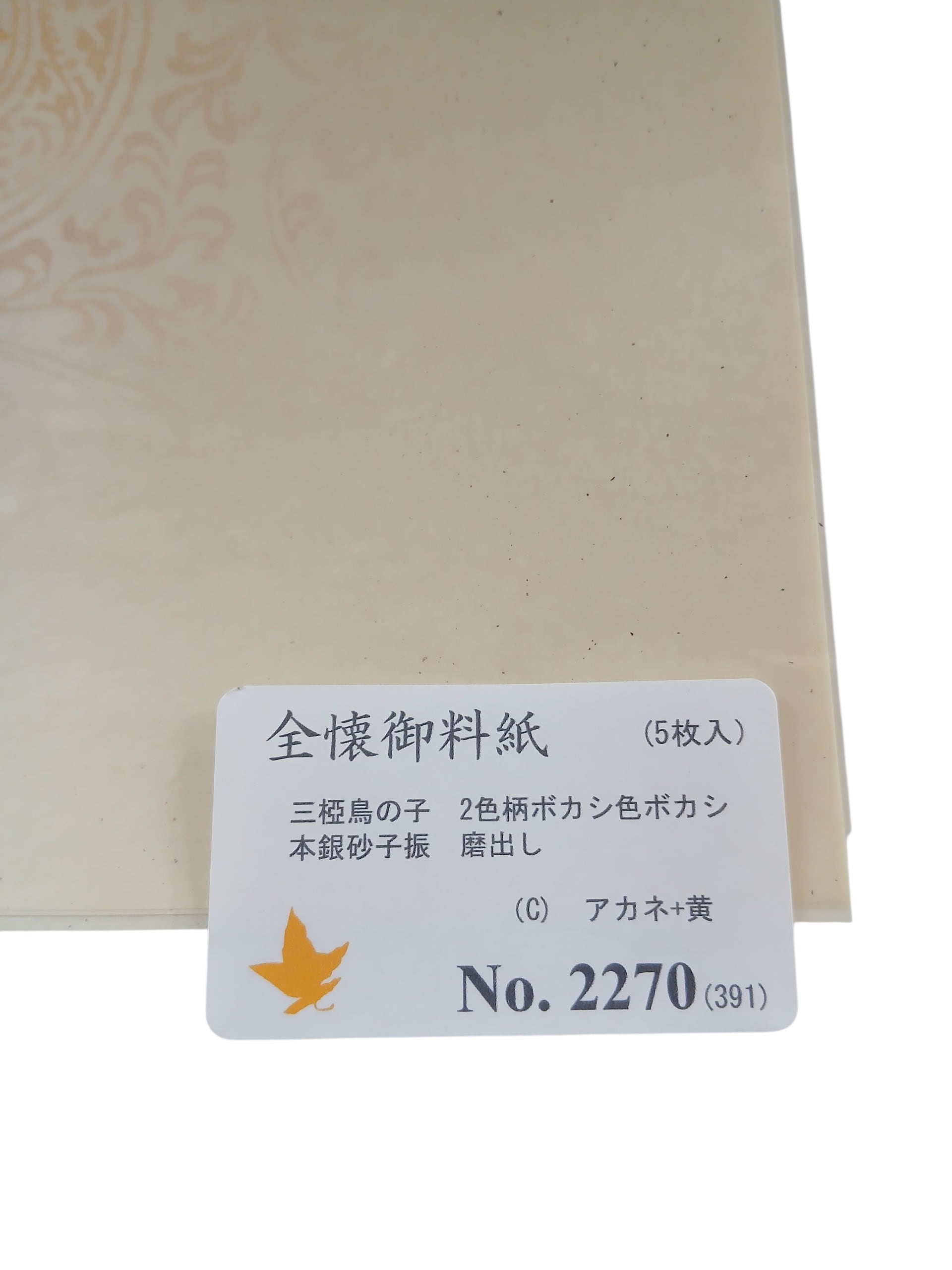 この全懐御料紙は、鳥の子紙を使用し、2色柄のボカシが施されています。本銀砂子振りの技術により、アカネ色と黄色の美しいグラデーションが生まれ、独特な風合いを醸し出します。創作活動において、一層の魅力を引き立てる一品です。