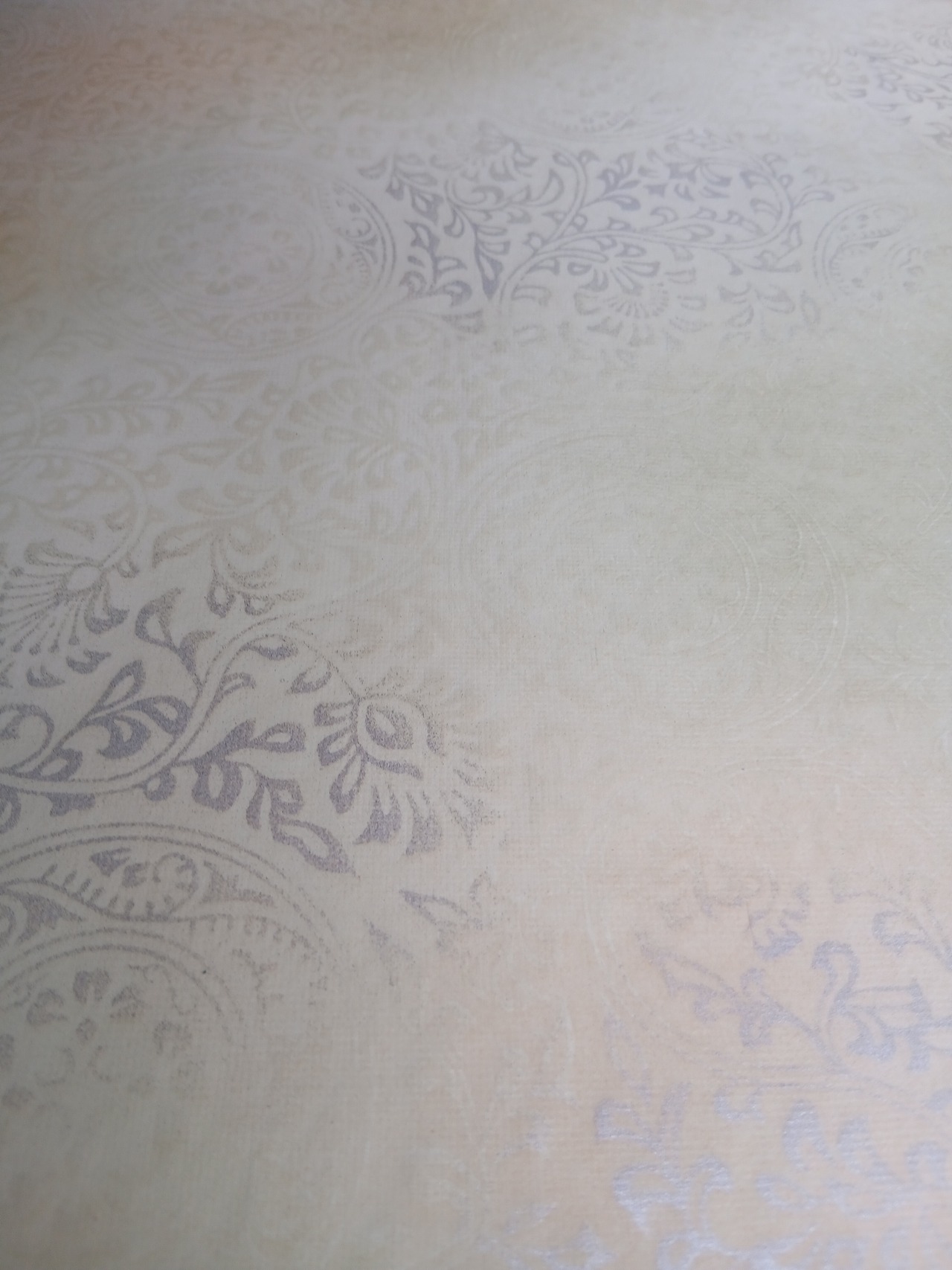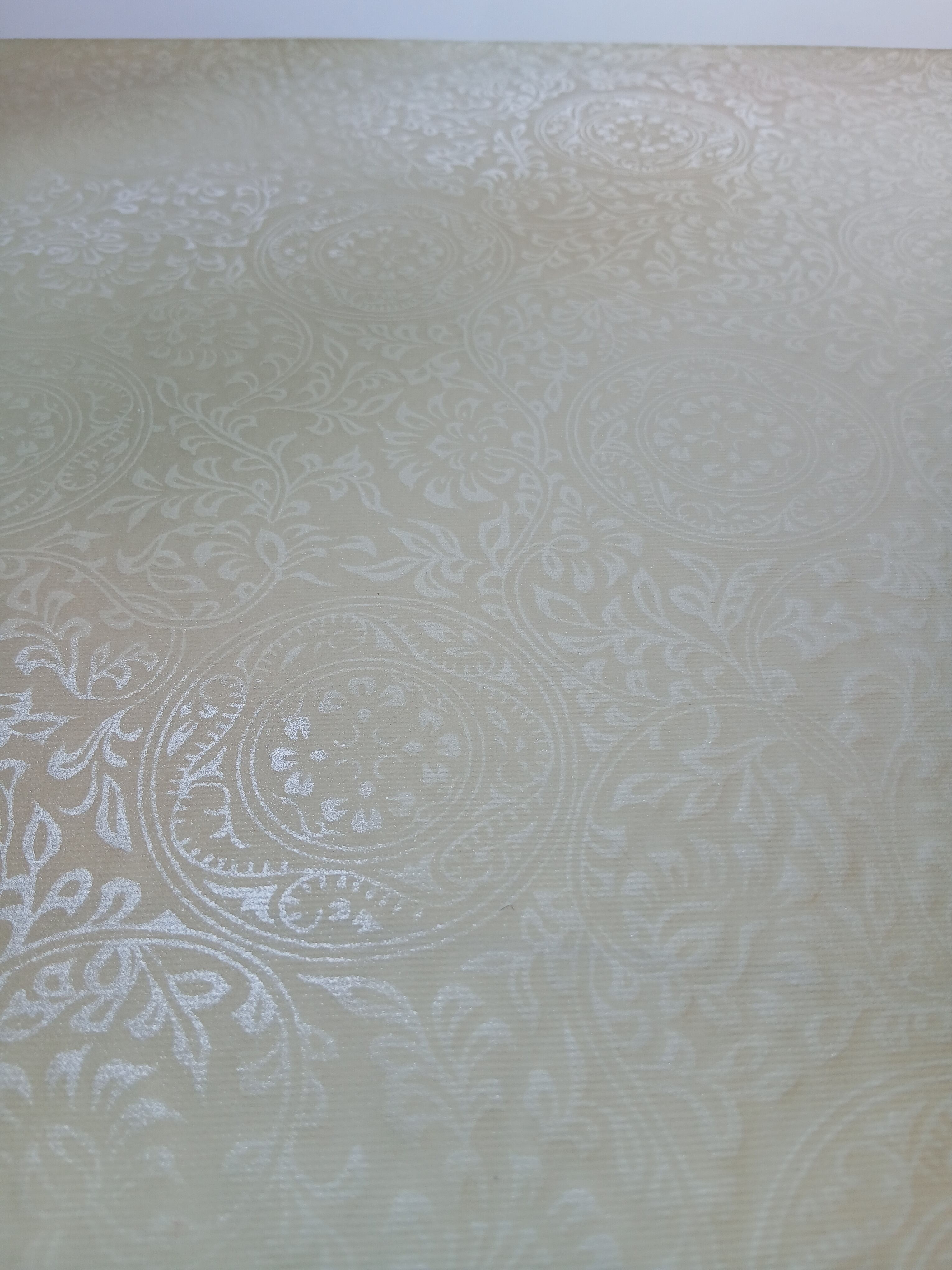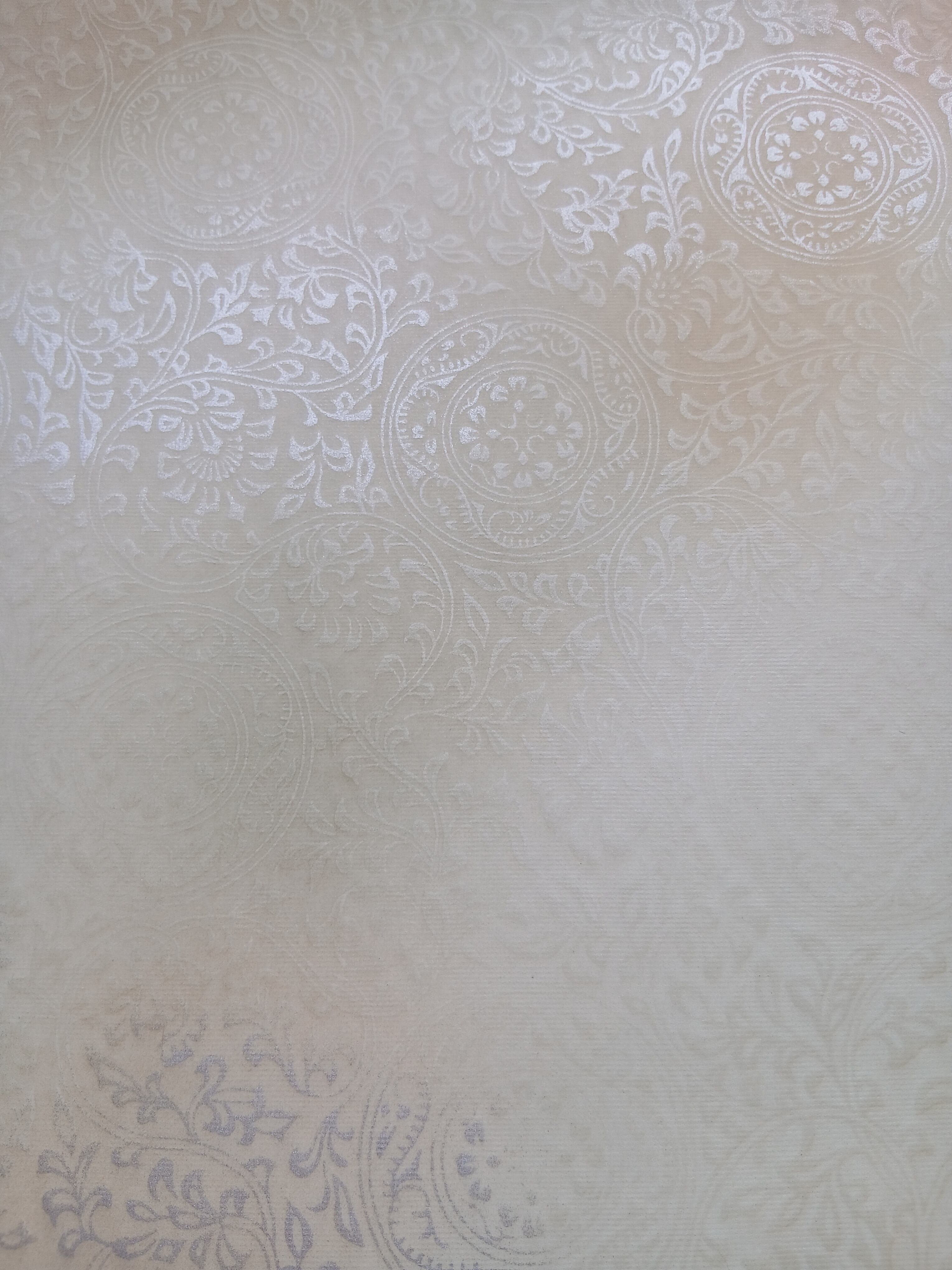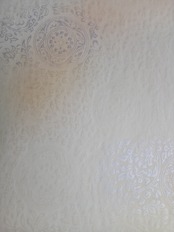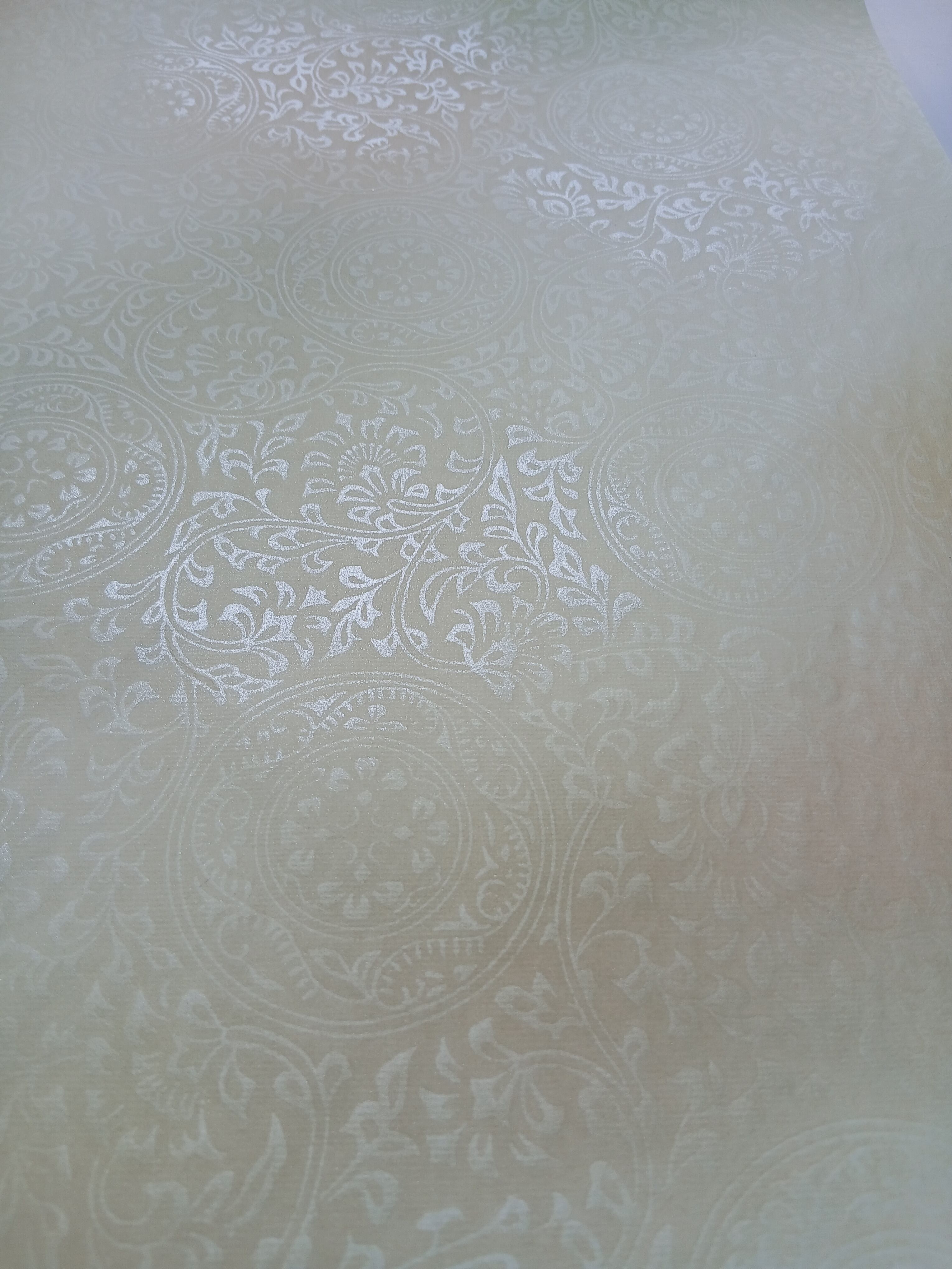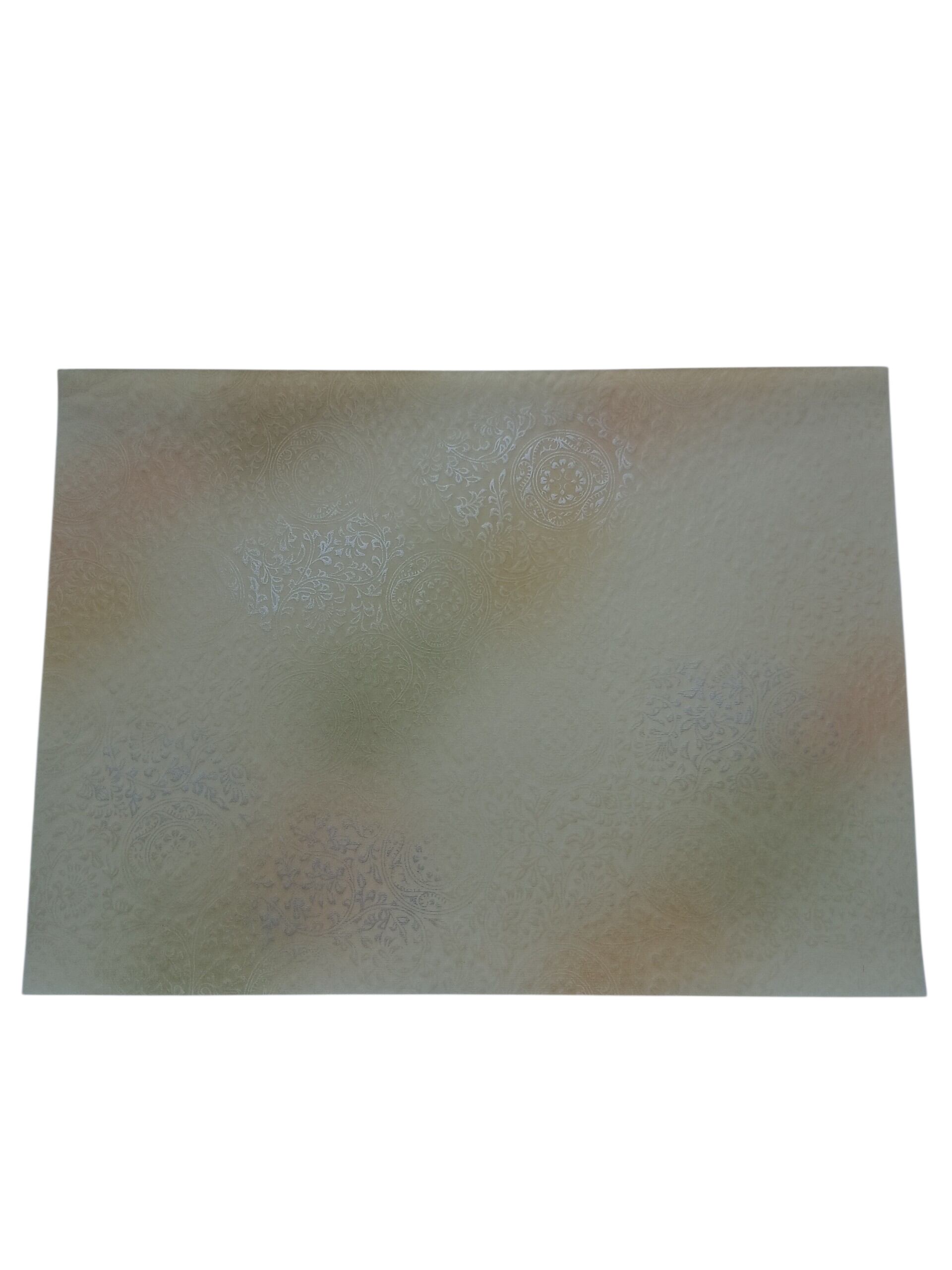 新鳥の子を使用した機械漉きです。具引きと全面ギラ型打ちの技術で仕立てられています。布目入りの表面は、独特の風合いを持ち、3色(柿茶、緑グレー、渋オード)の破継風ボカシが施され、全体ボカシ風銀砂絵が美しく描かれています。作品に立体感と奥行きを与え、様々な表現を楽しむことができます。