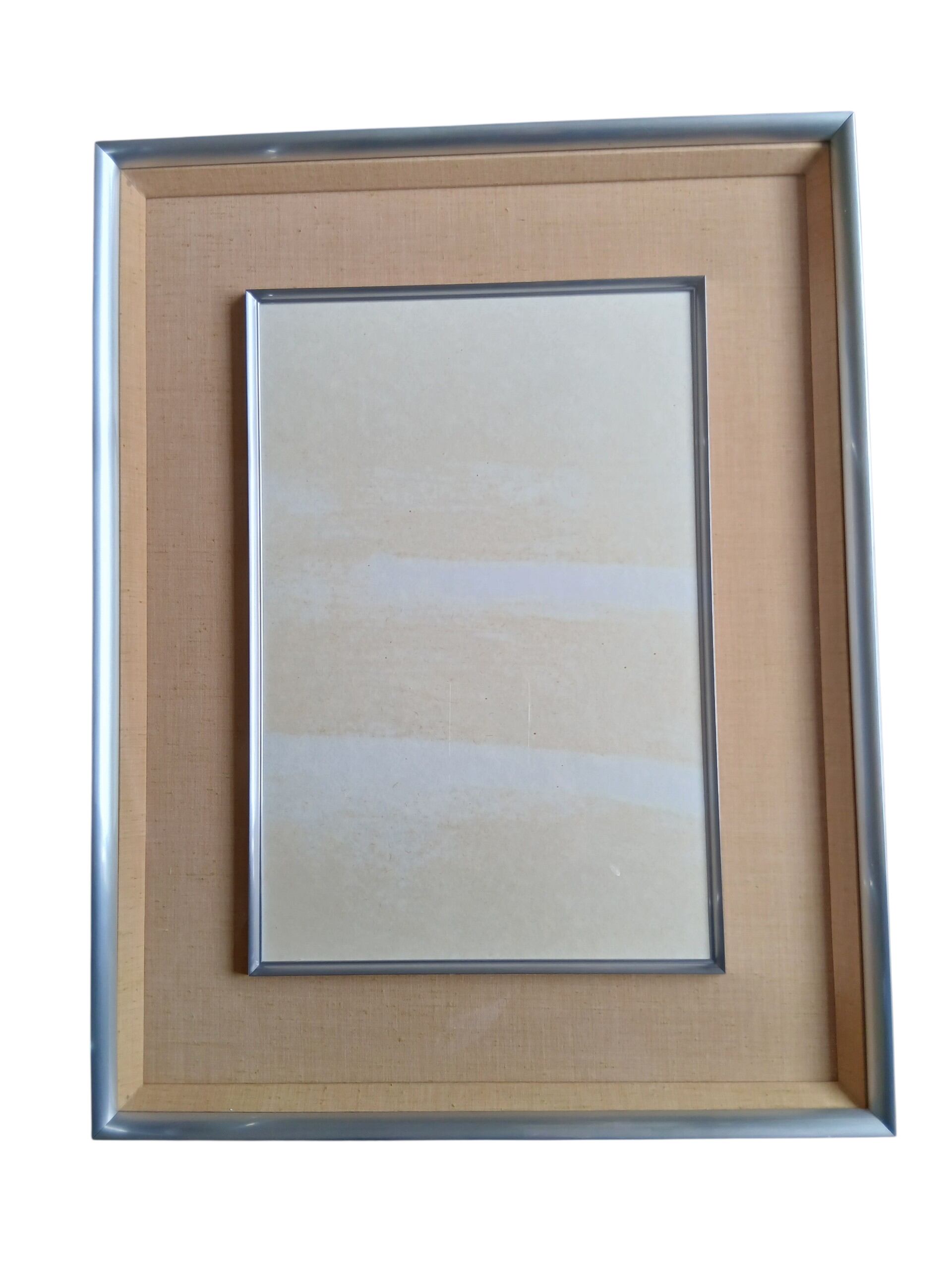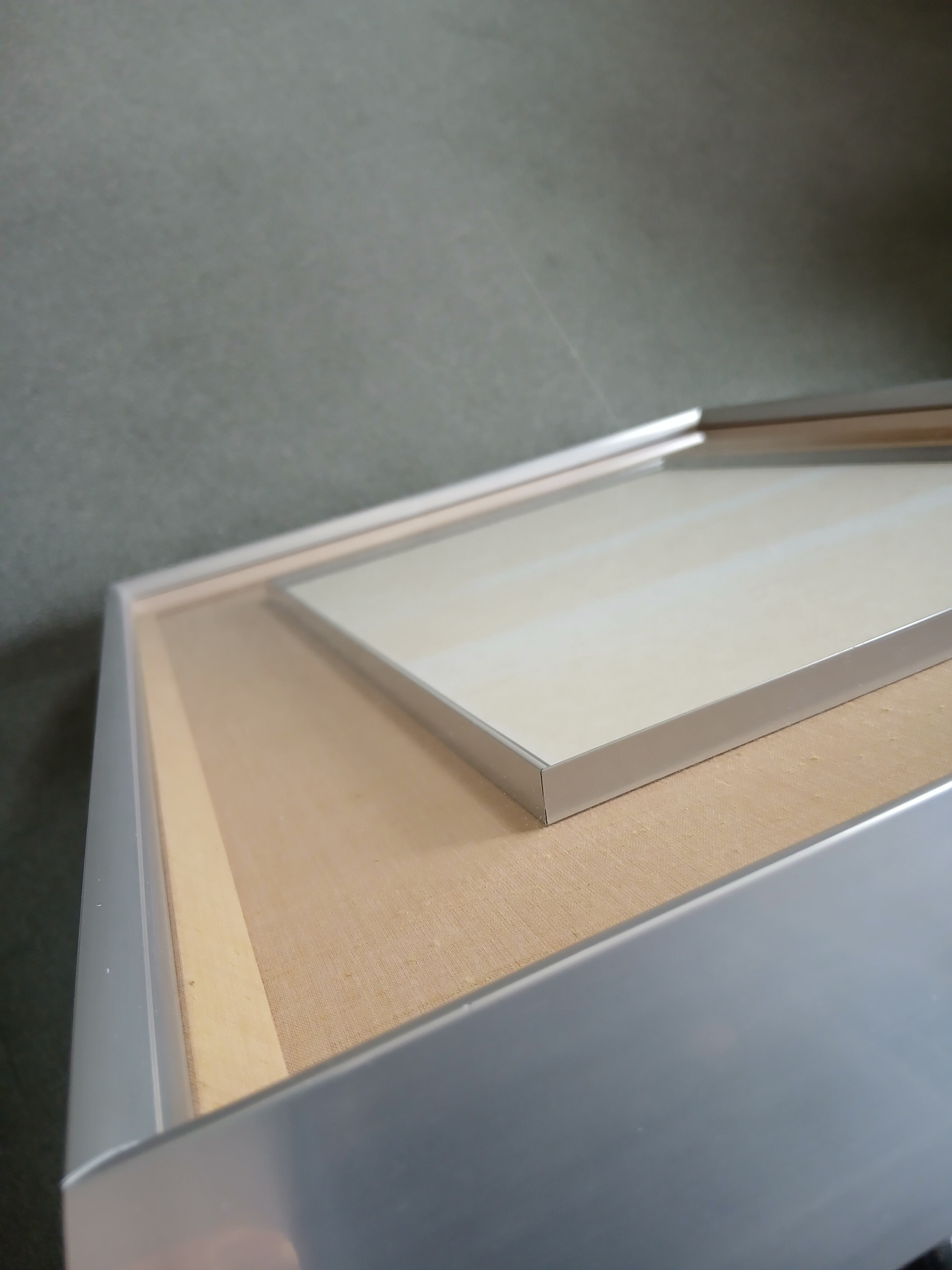 この額は、半懐紙を美しく飾るためにデザインされています。サイズは縦55×横43×高5cm縦掛け・横掛けの両方に対応しており、シーンに合わせた飾り方を楽しむことができます。なお、縦に掛けた際の左上角には若干の染みがございますが、特別価格でのご提供となっていますので、コストパフォーマンスにも優れています。